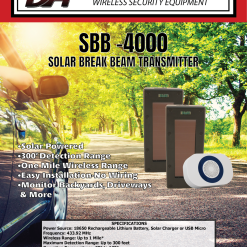 The Dakota Alert BBA-4K-PLUS is a wireless, infrared, solar-powered break beam (photo beam) sensor that mounts quickly and is easy to install since no wiring is required. The break beam sensor is a point-to-point sensor that is intended to detect people and vehicles, or large animals depending on placement, while preventing the detection of small items like falling leaves or birds. For round-the-clock security, lithium-ion batteries are recharged by solar panels in the daytime.